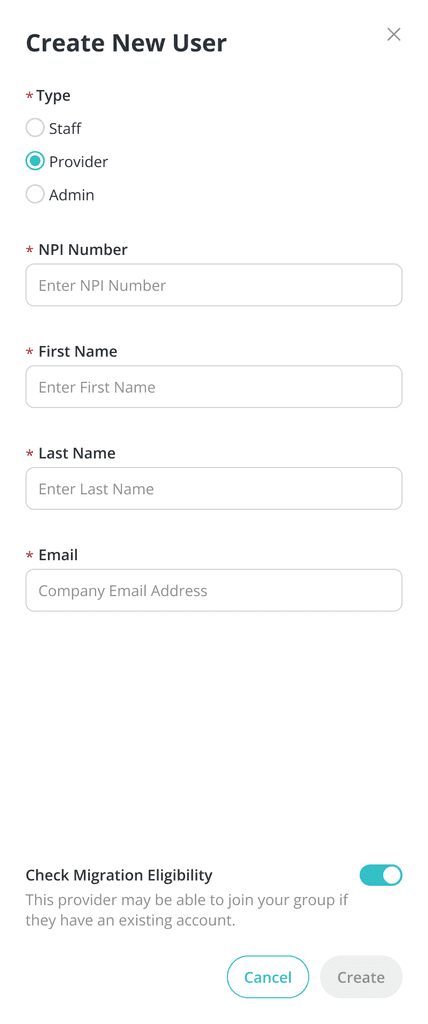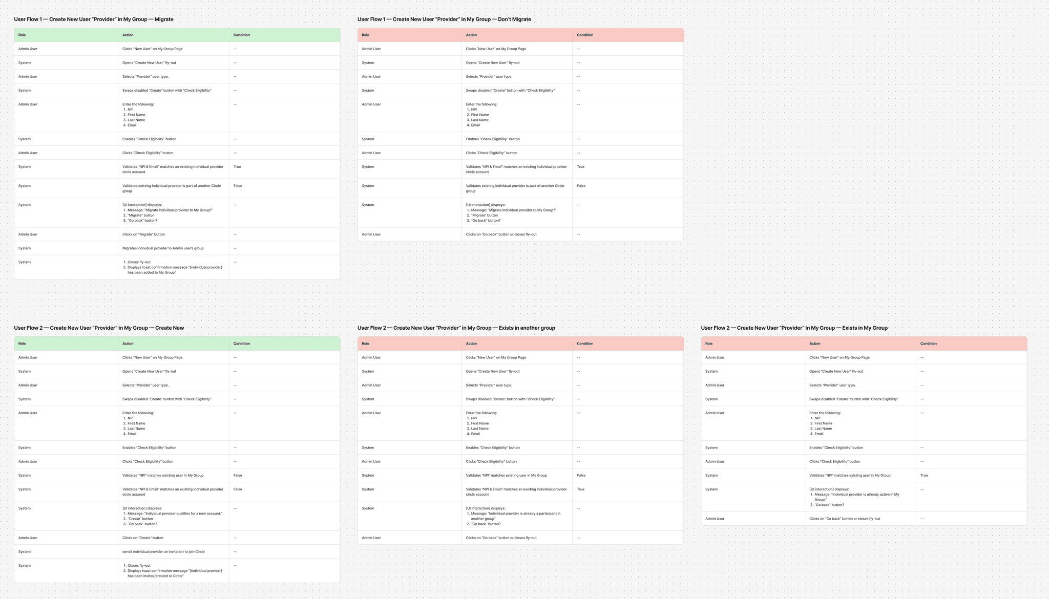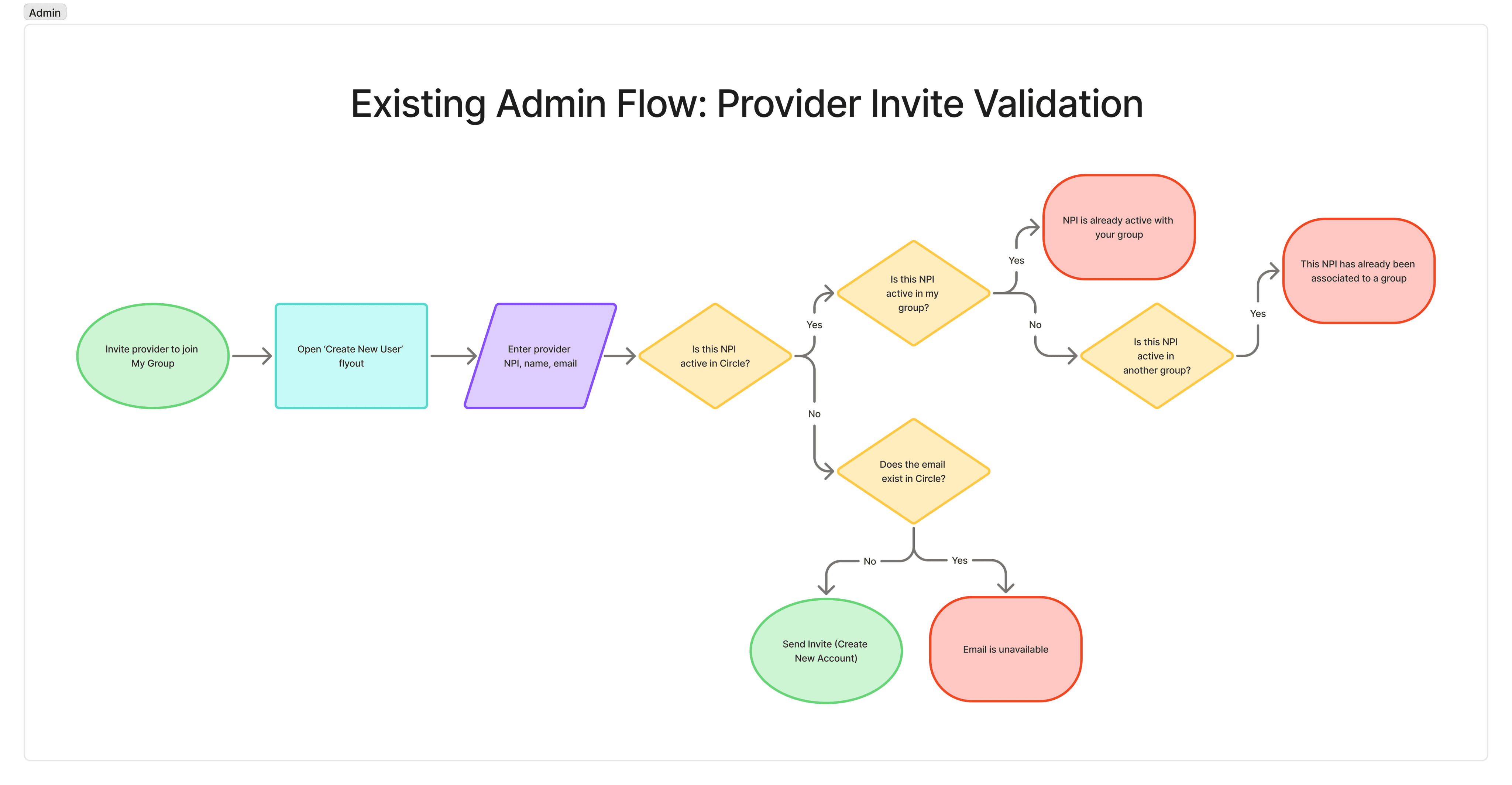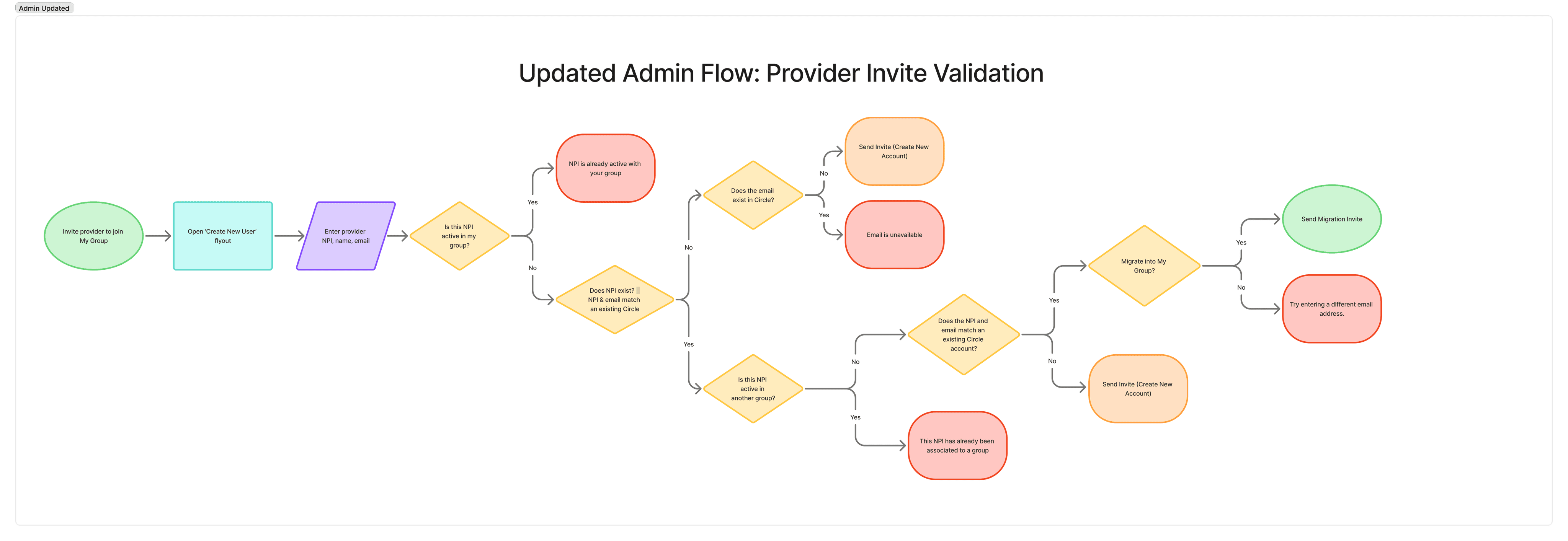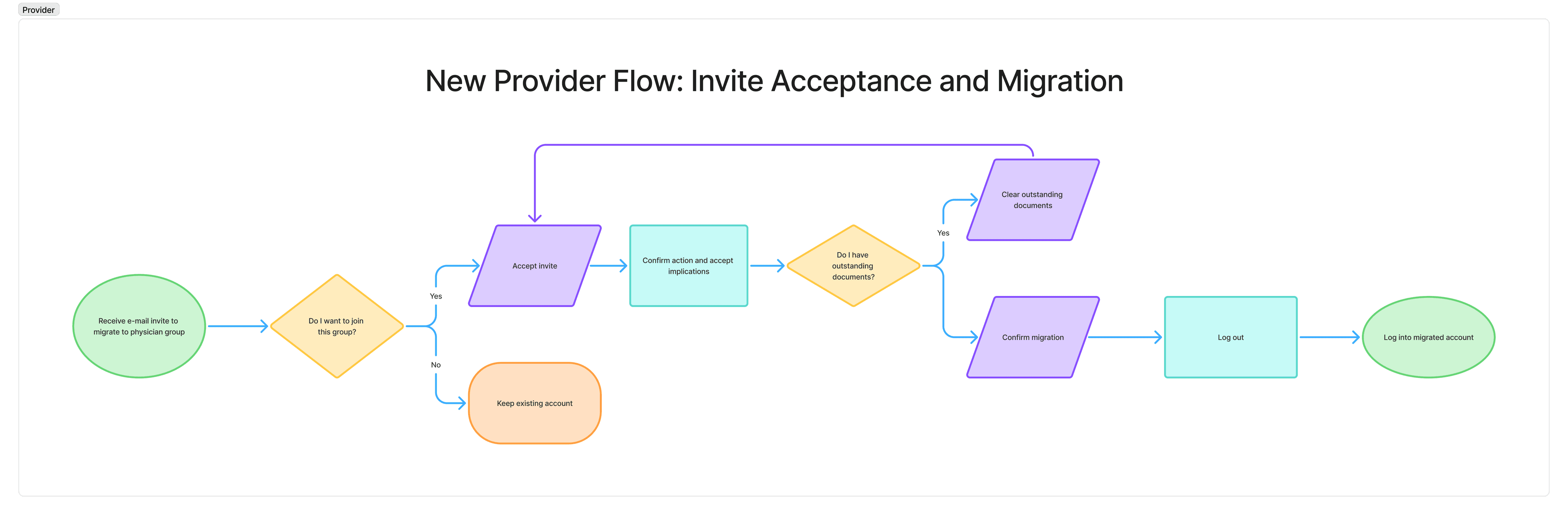 Early conversations with the engineering team helped us map out the existing backend validation logic and how provider migration, moving an existing provider account into a physician group, could be integrated into it. Our goal was to design a simple, intuitive experience that fit seamlessly within the current flow, surfacing only the information users needed at the right moment.