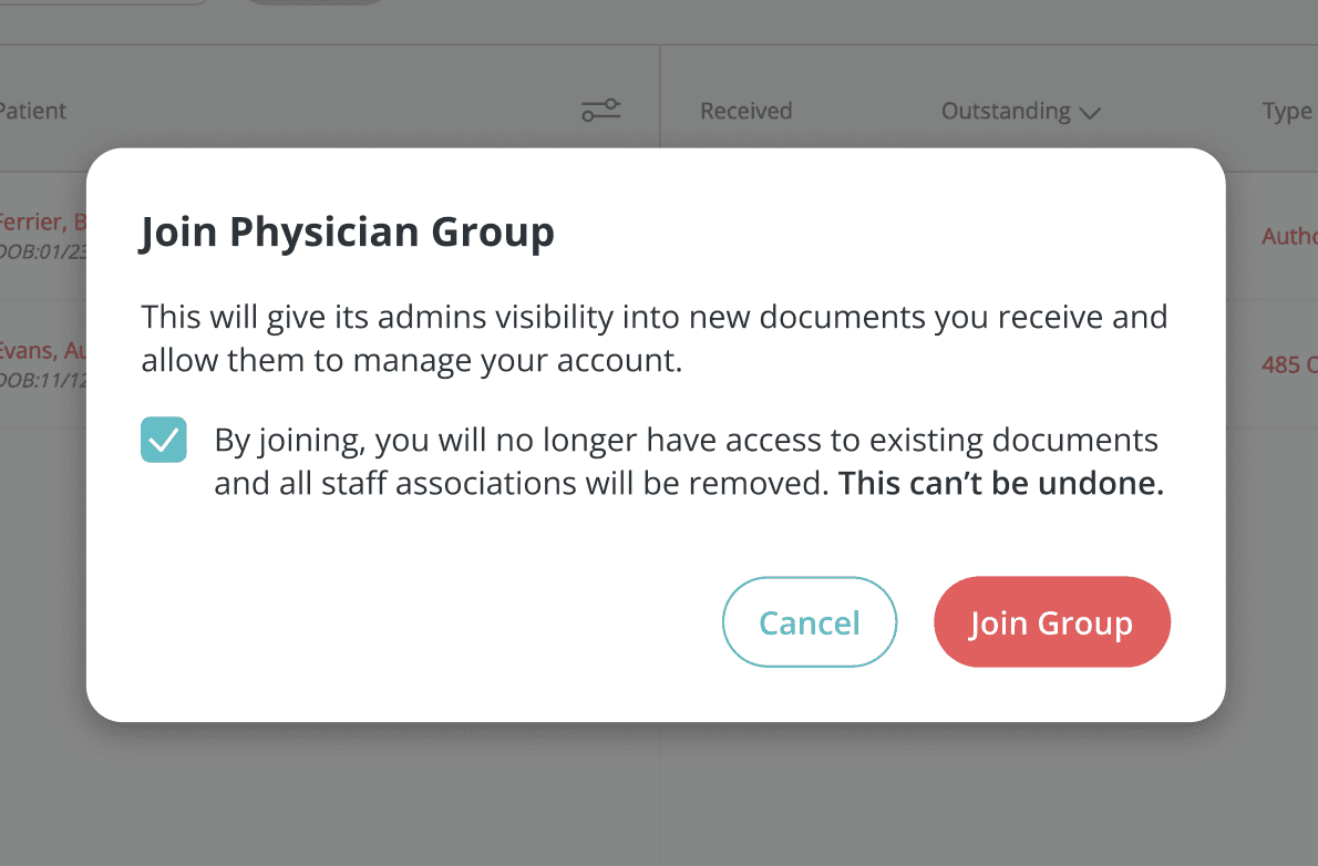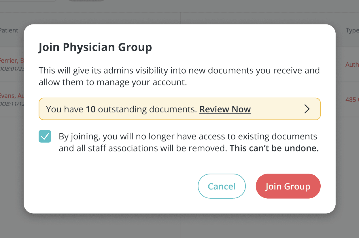 Once an invite is accepted, the provider is securely logged out and transitioned into their new account, with previous documents removed to meet HIPAA compliance requirements. Users would be allowed to address any outstanding documents before moving forward.
