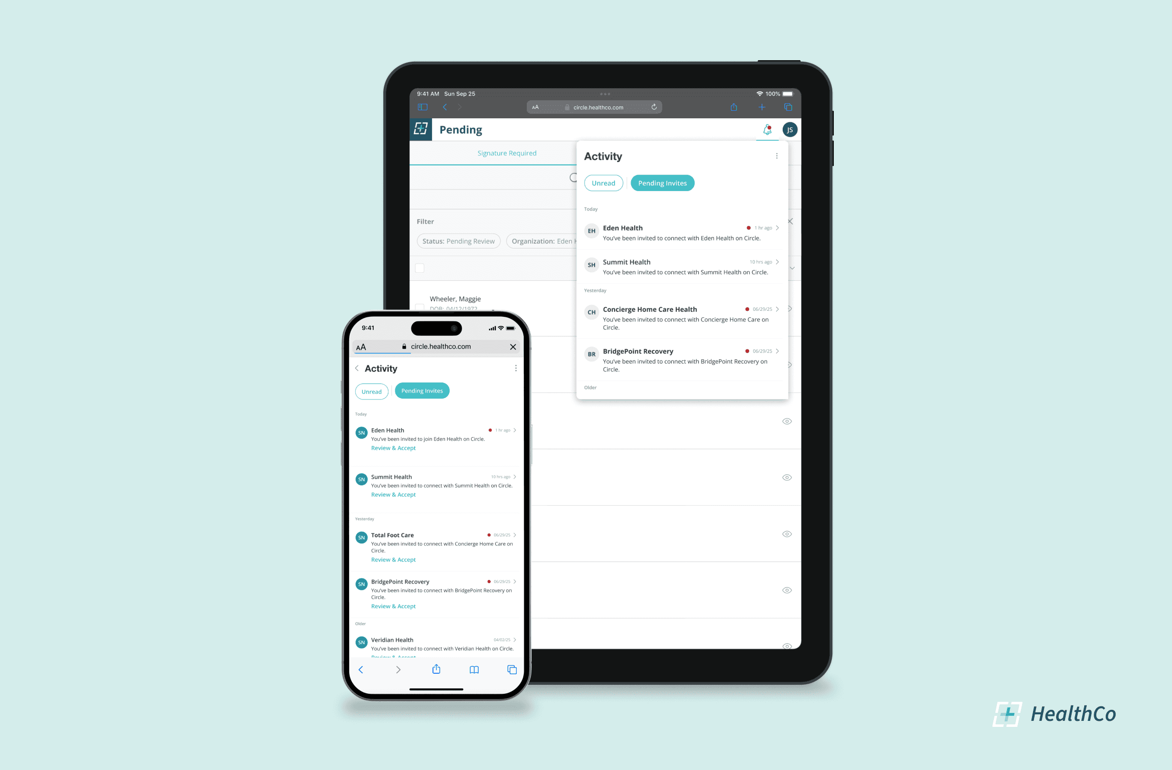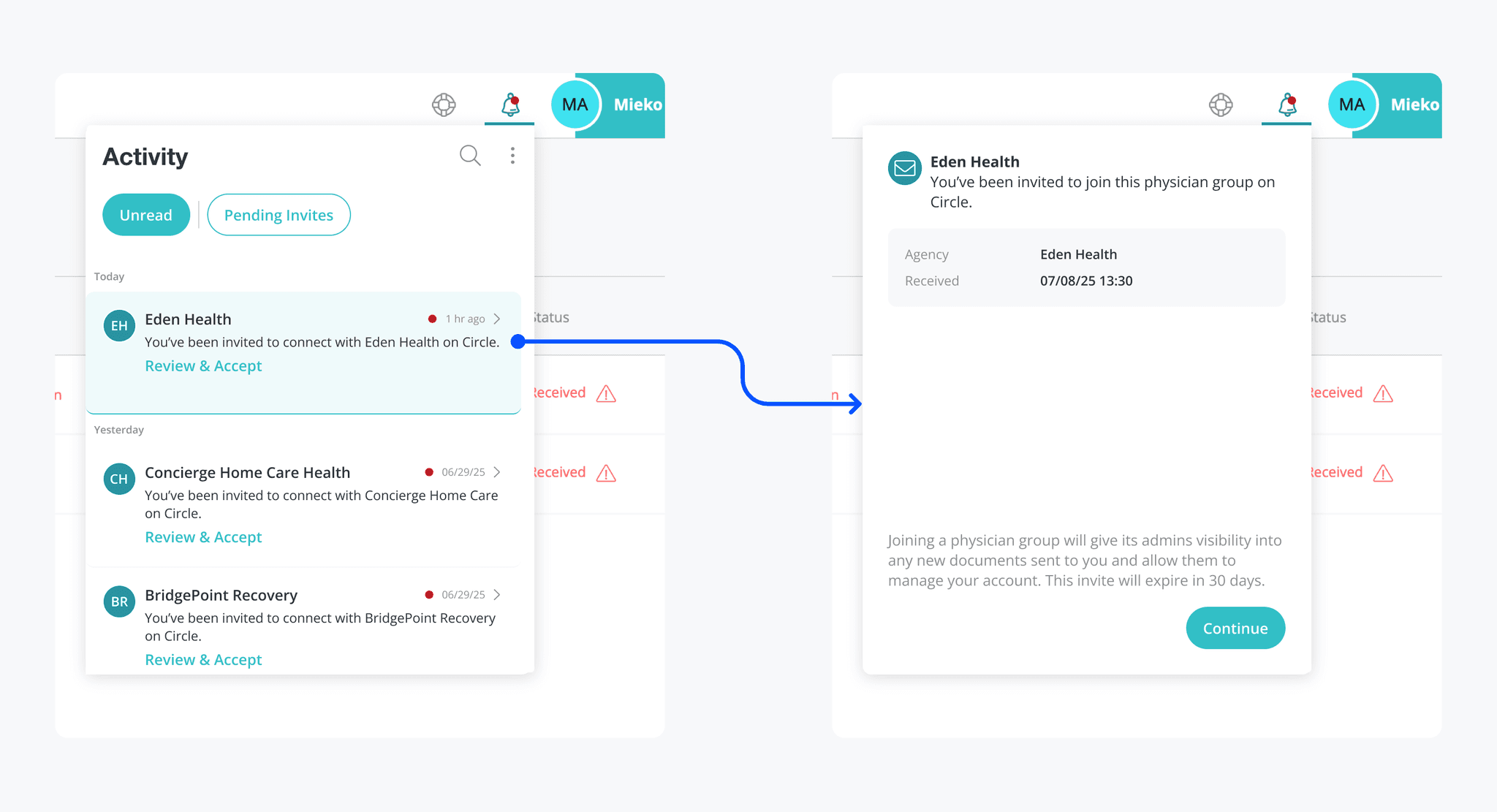 Circle connects healthcare providers with post-acute care agencies. As the platform scaled, migrating individual providers into group accounts became a pain point. The UX for automated provider migration was designed to translate insights into a clear flow, providing users full visibility into their pending and accepted invites.